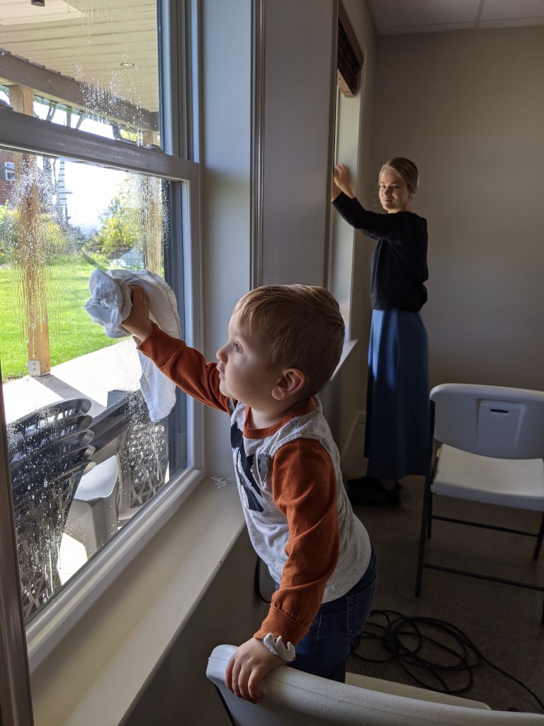 We left Wendy and Annalisa at Sowers for the day, and the rest of us headed back to ABT headquarters to do odd jobs around the grounds. The ladies washed windows and blinds with Theo’s help.