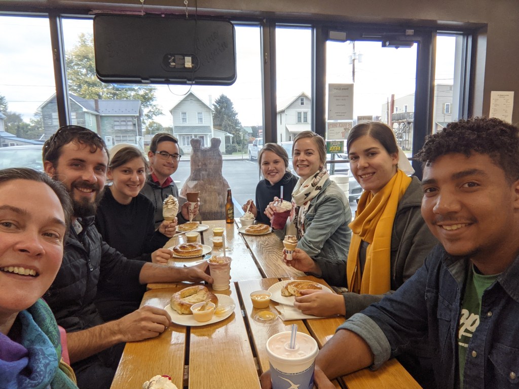It was a restful, smooth day of driving. We ate our packed lunches in the van because it was too cold to stop for a picnic. At one point, we drove through snow flurries, and we heard of a dusting of snow in Guys Mills this morning. Someone had gifted us with $50 to spend on a treat, so we stopped at the Ice Shack in Mill Hall and enjoyed that break!